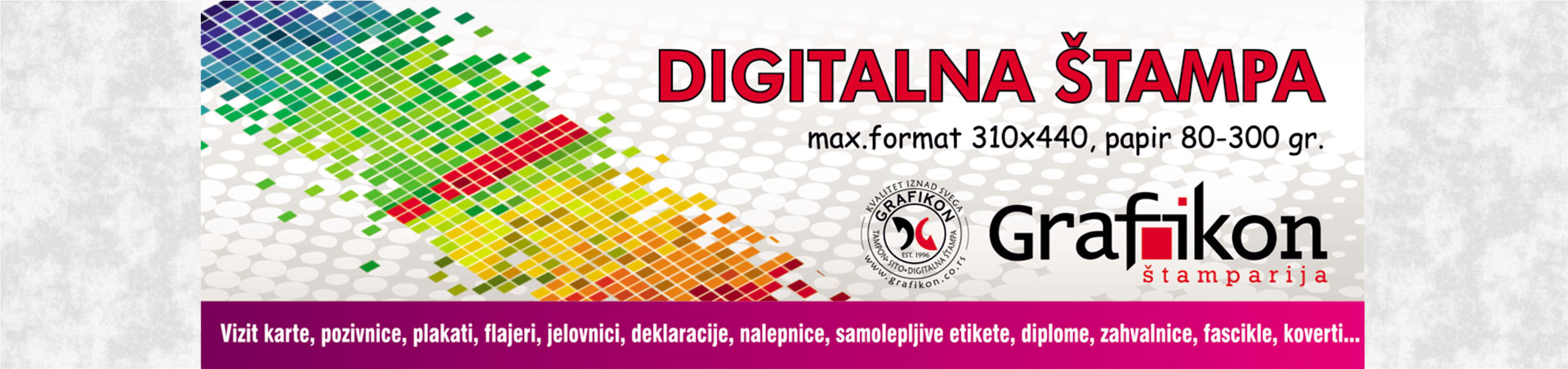 Grafikon je osnovan 1996 godine. Počeli smo u veoma skromnim uslovima, ali sa jasno zacrtanim ciljem i planovima za budućnost. Tokom godina uspeli smo da stvorimo malu porodičnu štampariju koja i dalje raste i razvija se. Naši cenjeni klijenti koji nam se redovno obraćaju sa novim zahtevima samo su nam velika podrška i stimulans u našem radu na putu ka novim uspesima i kvalitetnijem poslovanju, na obostrano zadovoljstvo. Kao i do sada, trudićemo se i u budućnosti da vas ispoštujemo kao i da uvećamo ponudu artikala i usluga, u cilju Vašeg i našeg napretka.